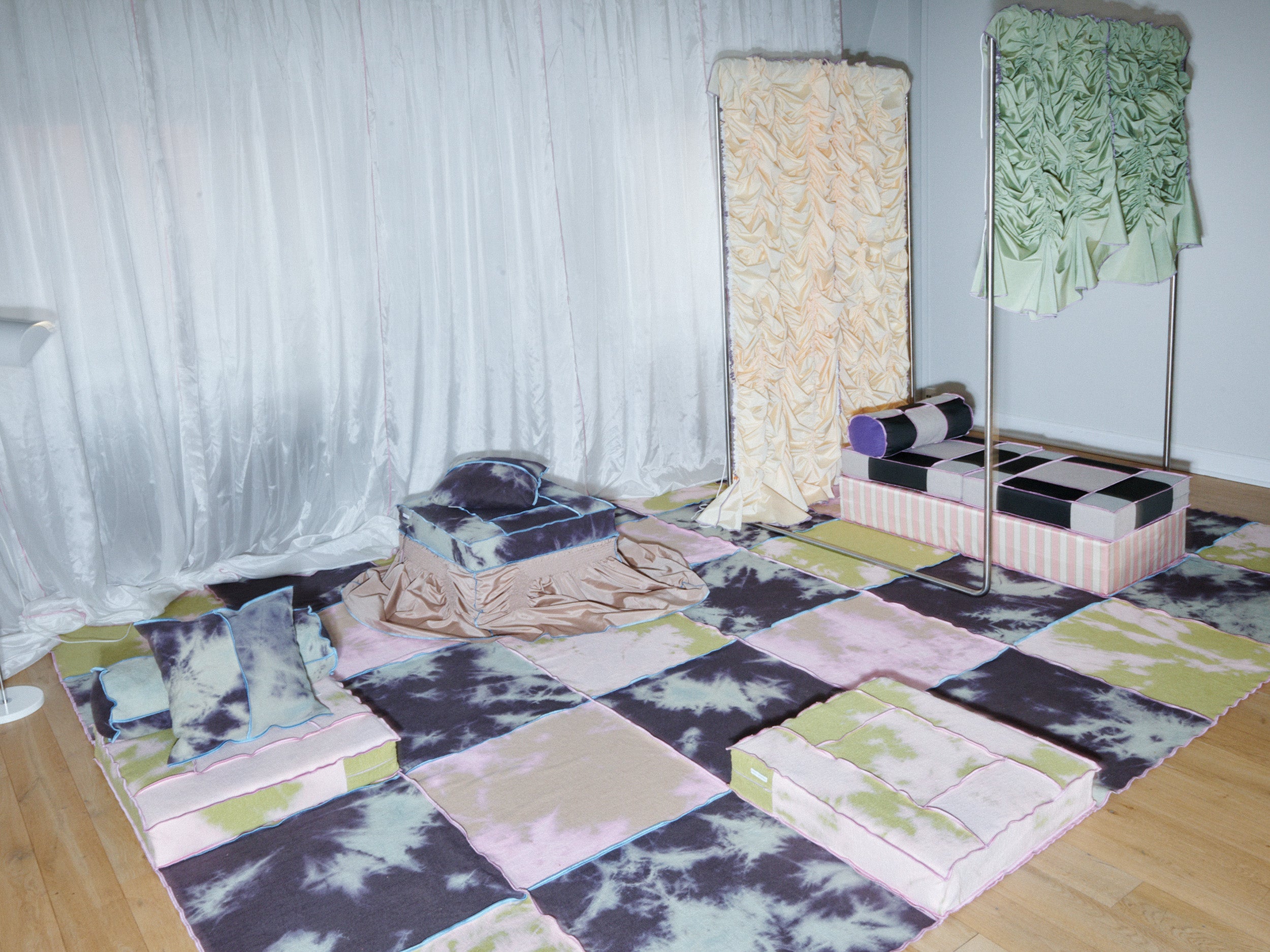 A soft architecture that reimagines space through discarded textiles. Inspired by patchwork, Rococo interiors with their pastel silks, striped fabrics, layered curtains, and canopy beds, and the language of fashion, the installation transforms forgotten fabrics into structural, playful, and unexpected forms.