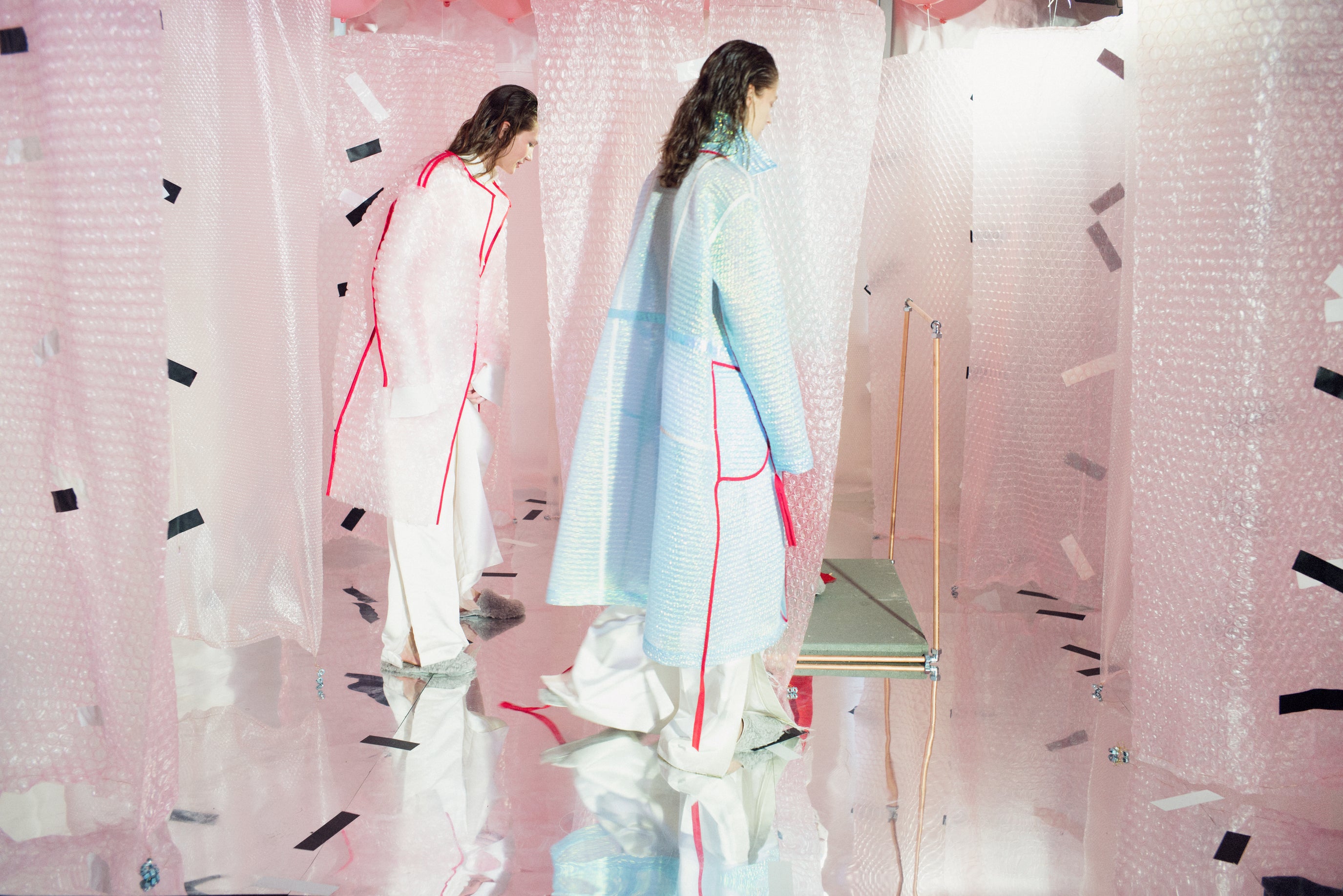 The models wear coats that echo the installation: one crafted from the same bubblewrap as the curtains, and another in a silk reinterpretation, linking fashion and environment in a continuous, tactile dialogue.